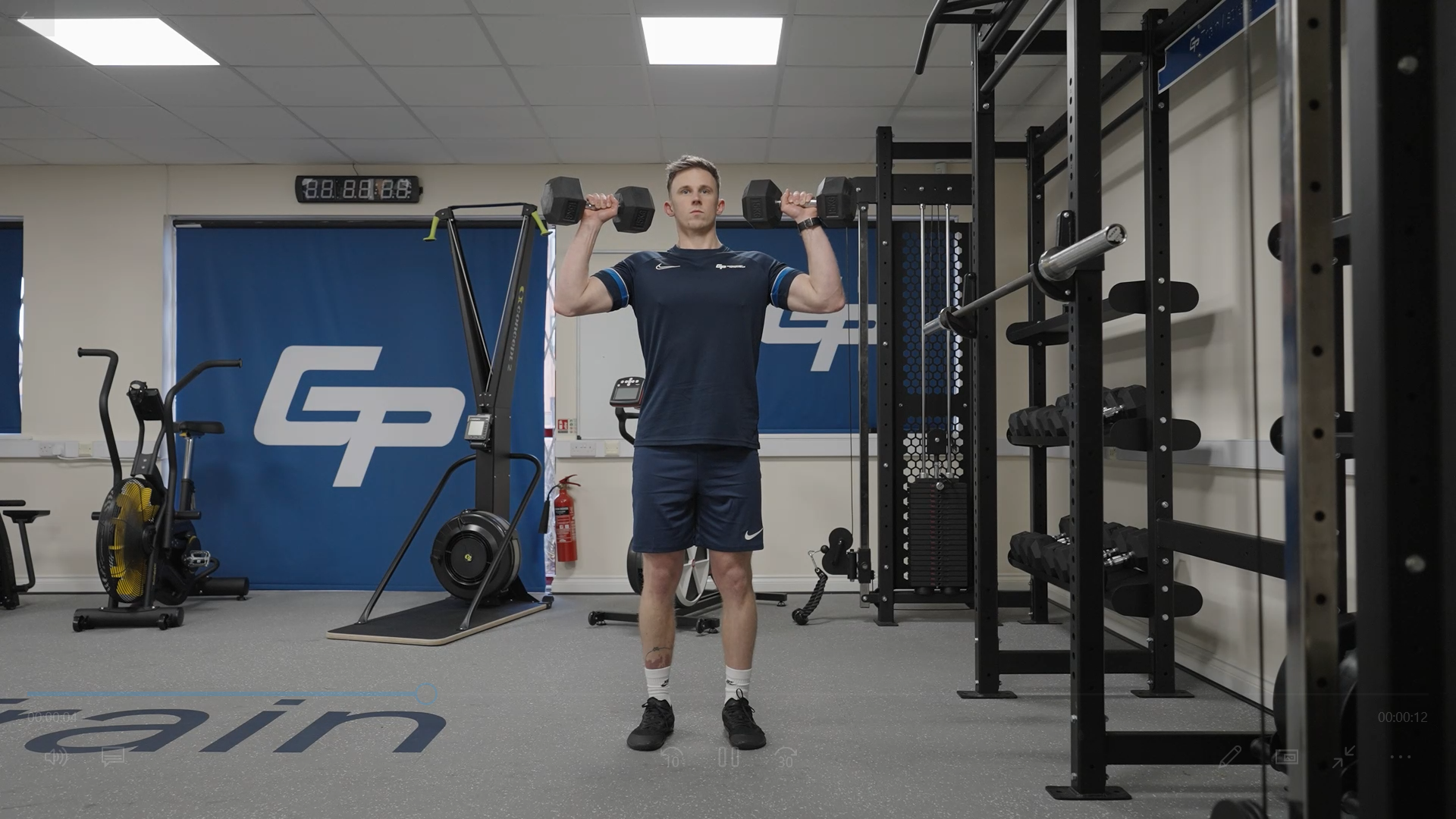 2. Breath in and raise the dumbbells until they are shoulder height, slightly in front of the body to hit anterior and medial deltoids.