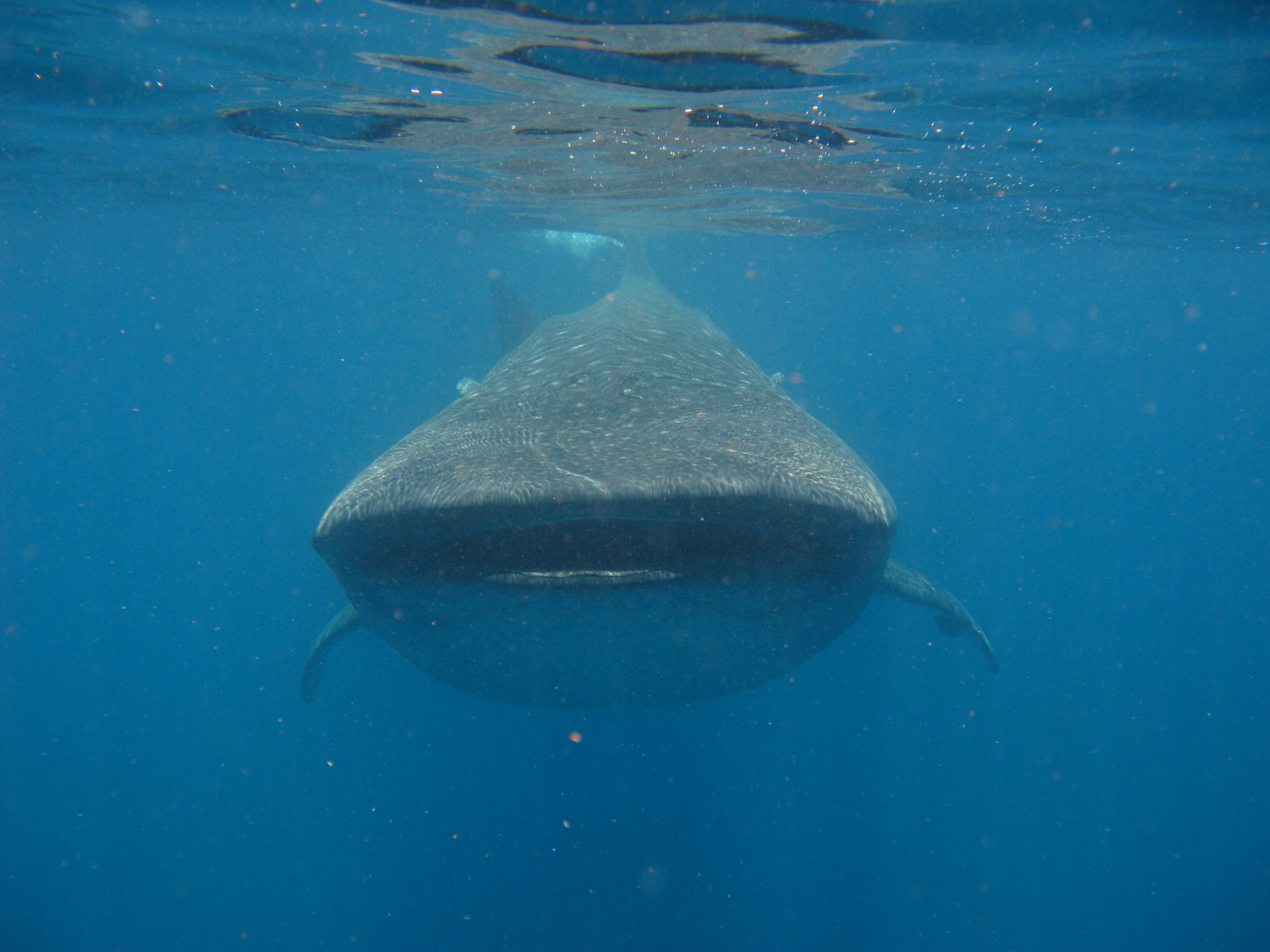 A large whale sharks swims along the surface, likely getting mouthfuls of fish eggs and other plankton.