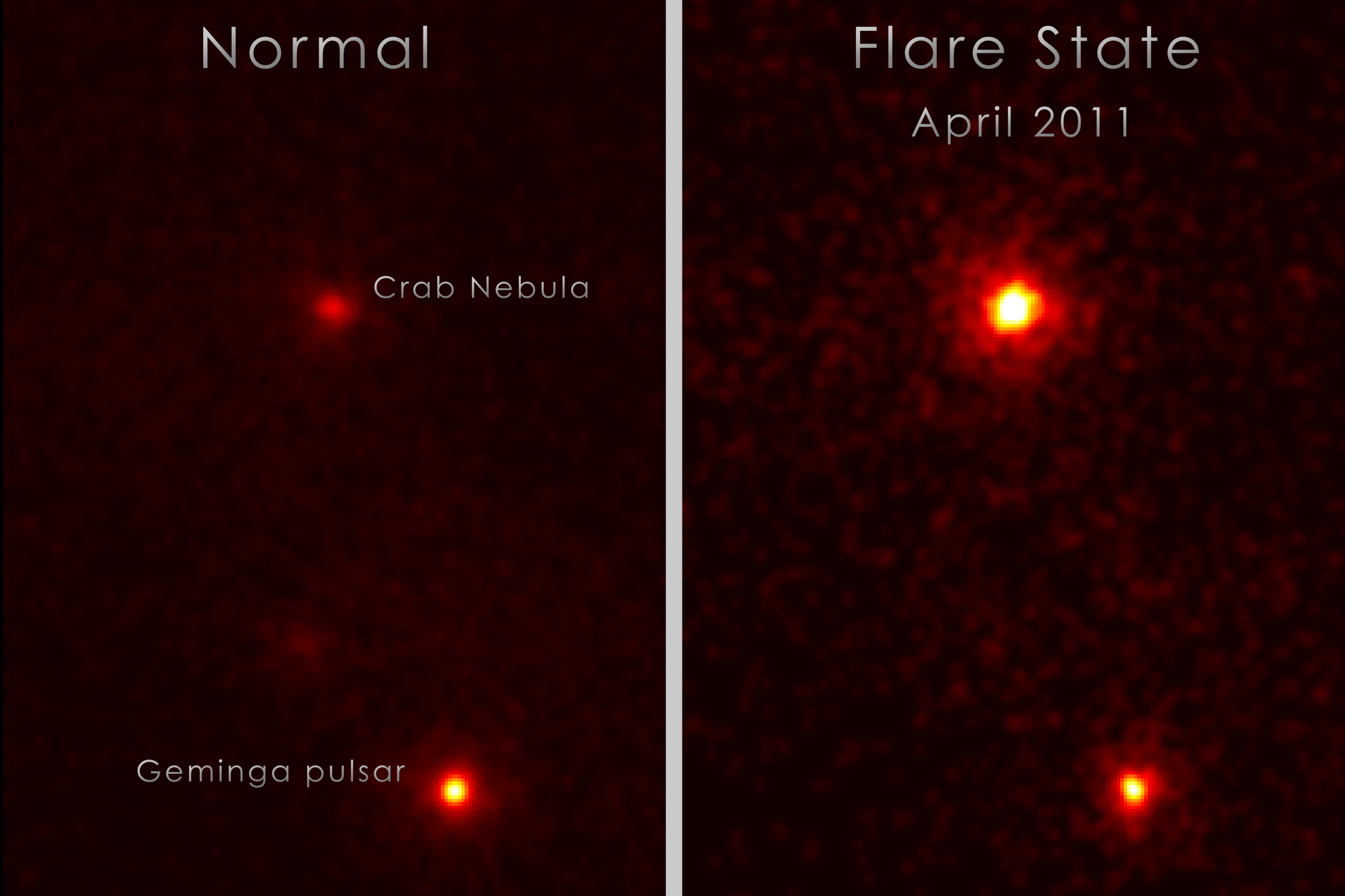 Scientists are still searching for the answer, but they think the flares occur as the intense magnetic field near the pulsar undergoes sudden restructuring. Such changes can accelerate particles like electrons to rapid velocities near the speed of light. As these high-speed electrons interact with the magnetic field, they emit powerful gamma rays.