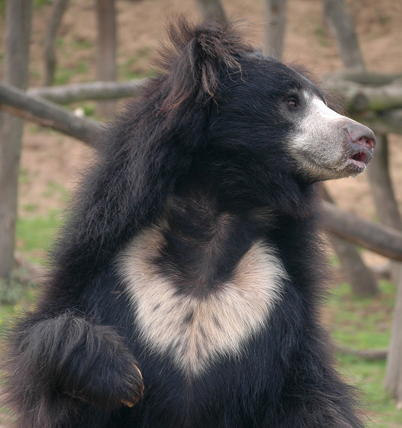 The sloth bear (melursus ursinus) has a light yellow U or Y-shaped marking on its chest and a dark coat that is shaggier than most of the other bear species. Not to be confused with a sloth, the sloth bear is a docile animal that reside in warm, humid tropical wooded areas or in grasslands near the equator. They primarily live in Southeast Asia, in the forests of Sri Lanka and India.