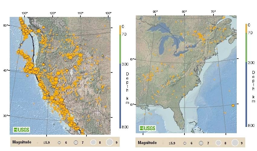 There is a history of damaging quakes in the eastern United States, however. A destructive quake hit Charleston, S.C., in 1886, damaging thousands of buildings. Its magnitude was probably near 7.0 on the Richter scale. And in 1755, a quake with around a 6.0 magnitude struck off the coast of Massachusetts.