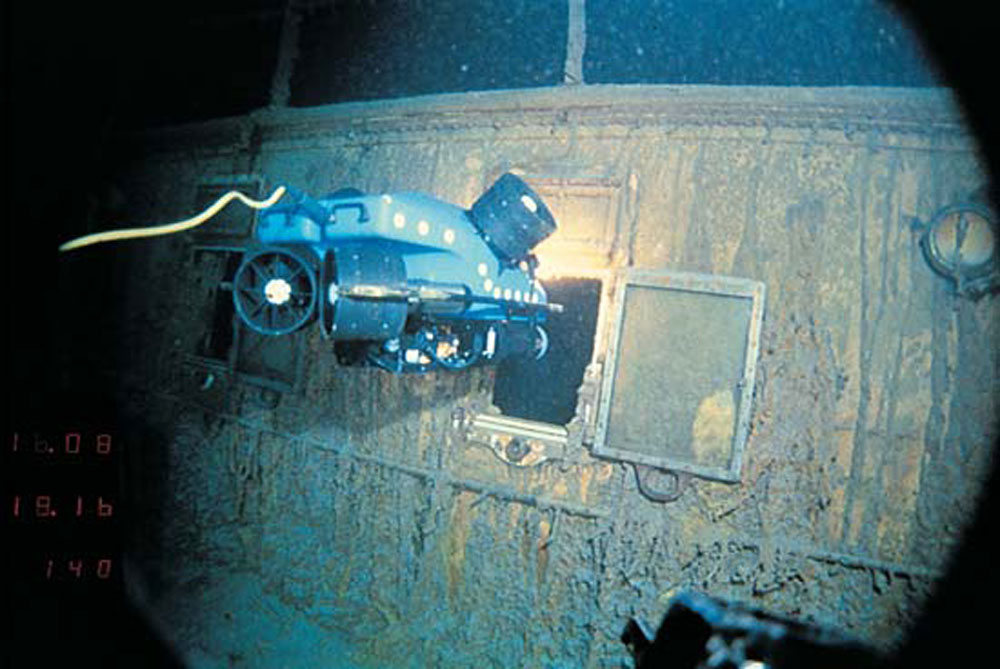 The remotely operated vehicle Jason Jr. uses video recording equipment to peer into the Titanic's stateroom. The ROV dove and examined the wreck while tethered to its command ship, a U.S. Navy-owned submarine named Alvin.