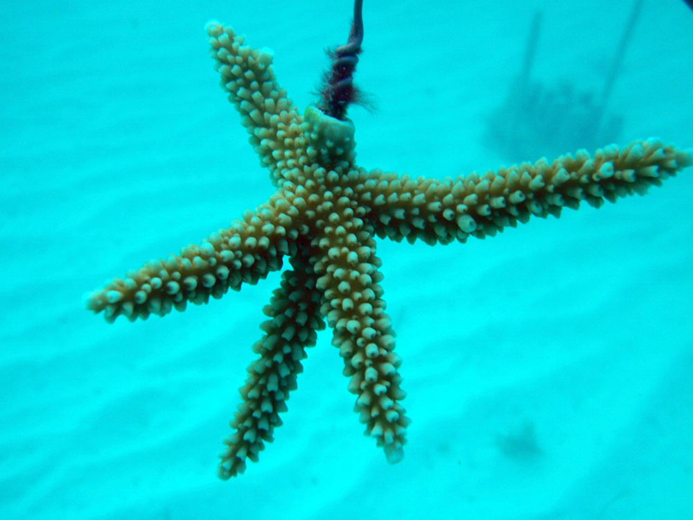 The growth rate of a coral fragment depends on its genotype and the nursery method used to cultivate it. For example, the fragments can also be grown hanging from a line or strung from a "tree" fixture underwater.