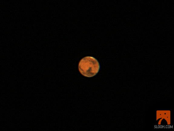 Through the Slooh space camera, which provided a view of Mars through telescopes at observatories in Arizona and the Canary Islands, the Red Planet's full disk could be seen, including its northern polar ice cap and broad features.