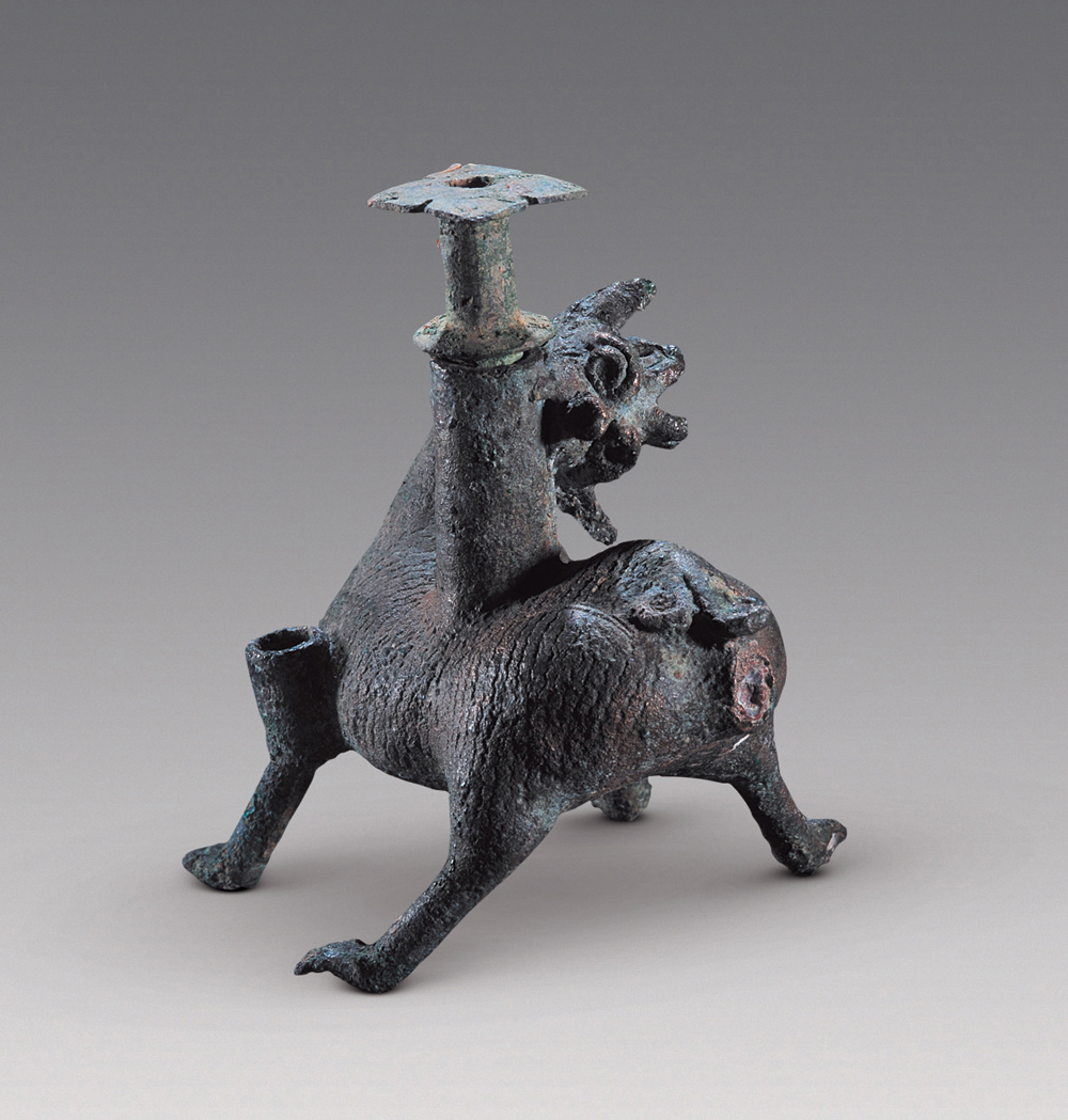 This bronze vessel stand shows a furry beast, with curly horns on its forehead, turning its head and biting.
