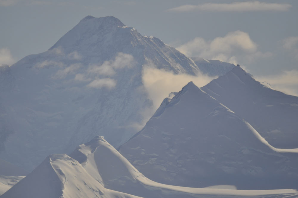 The Ellsworth Mountains (shown in the background here with the drilling site in the foreground) stretch some 200 miles (322 km) long and 30 miles (48 km) wide. They are located at the base of the Antarctic Peninsula.