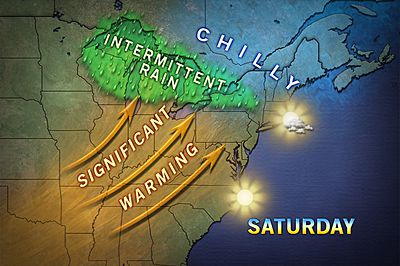 Farther northwest from upstate New York to northern New England, the transition to warmer weather will run into brief resistance in the form of clouds and spotty rain for a time spanning Saturday into Saturday night.