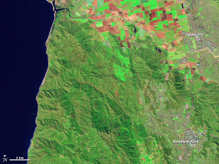 That's where satellite imagery comes in. The Landsat Data Continuity Mission, NASA's eighth Landsat satellite, launched this February and passed over the Springs Fire burn area on May 4. Burned areas appear in red, with the darkest maroons representing the worst-affected spots. Unburned vegetation is green and plowed farmland is brown. An earlier image from 2010 shows the landscape before the Springs Fire blazed through.