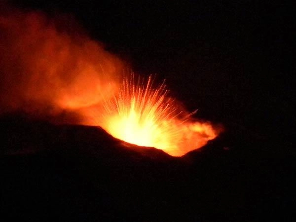 The eruption is what's called a strombolian explosion, named after the nearby volcano of the same name that has been erupting for hundreds of years. Bursting gas bubbles within the magma drive these explosions, which eject lava tens to hundreds of meters into the air from a single crater. These episodes happen every few minutes, rhythmically or irregularly. The lava fragments volcanic bombs are rounded as they fly through the air.
