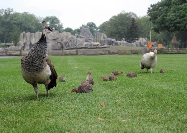 When it comes to raising their young, birds are known to be good and attentive parents. Raising the young of other birds is more questionable, but two Indian peahens at Brookfield Zoo have been doing a commendable job of keeping an eye on and providing some street smarts to some chicks of another species.
