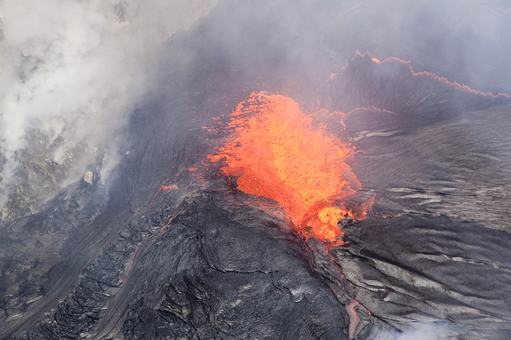 The lava lake in Halema'uma'u Crater at the summit of Kilauea volcano, with spattering along its western edge. The spatter from the lava lake was landing, in part, on the ledge adjacent to the lake, and then flowing away in a small channel toward the southern side of the vent where it was ponding and cooling.