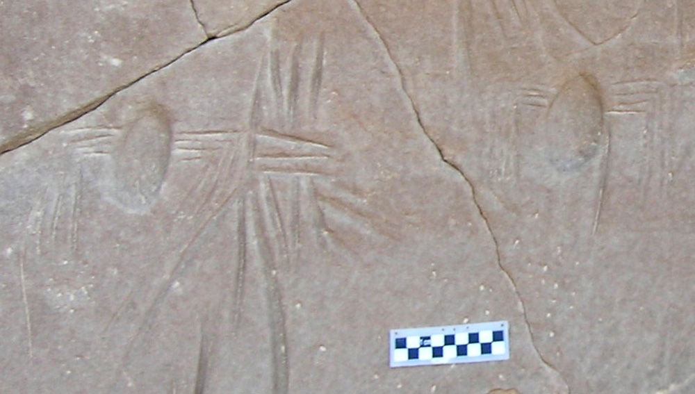 Archaeologists have discovered a broken panel that depicts the only known example of spider rock art in Egypt and, it appears, the entire Old World. It was discovered in a valley in the Kharga Oasis, in the western desert, about 108 miles (175 km) west of Luxor. The main panel, shown here, contains a few spiders. The spider at far left is beside a “star” that may actually be an attempt to depict a web.
