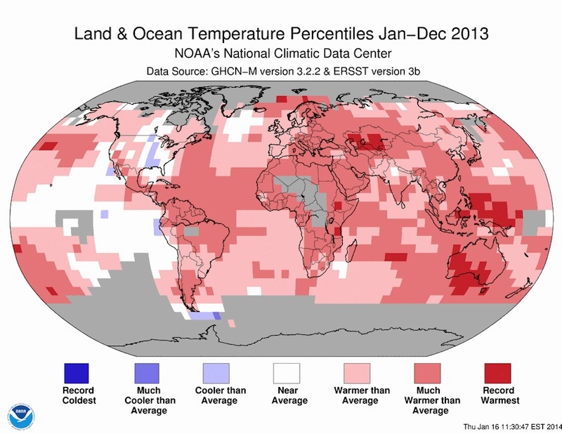 Most parts of the planet experienced above-average annual temperatures in 2013, NOAA officials said. Last year saw a surprisingly warm start to winter in Russia, heat waves in Australia that contributed to the continent's warmest year, and hot temperatures in Argentina that added to the nation's second warmest year since records began in 1961. Japan also experienced its hottest summer on record, Austria recorded its first temperature above 104 degrees F (40 degrees C) amid a hot summer, and Reykjavik, the capital of Iceland, saw its warmest January since 1987.