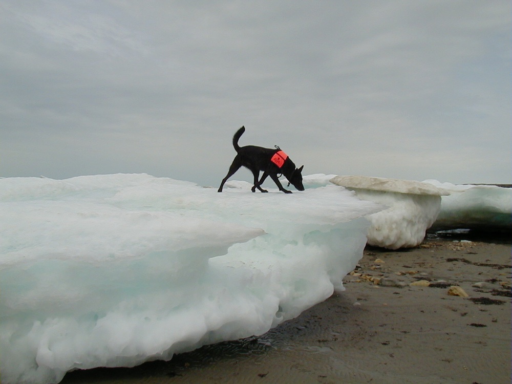 The dog found many piles of scat, and the team analyzed the contents.Here, quinoa sniffs for scat on an ice flow.