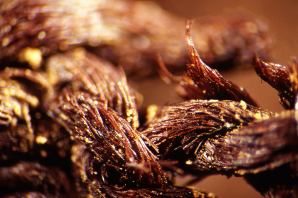 Resinous material is visible on these ancient fibers after one week in solvent. This image was taken at 125x magnification.