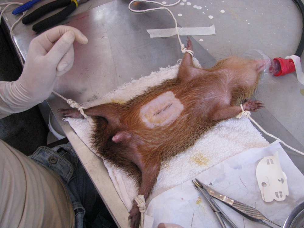 The scientists recovered data from three of the tagged tenrecs, finding the animal could hibernate for at least nine months without waking up. In fact, the scientists had to dig up one sleeping adult male tenrec because the transmitter batteries were dying and they didn't want to lose valuable data, Lovegrove said. Here, a common tenrec that received a surgical implant. (Photo Credit: Keri Lobban)