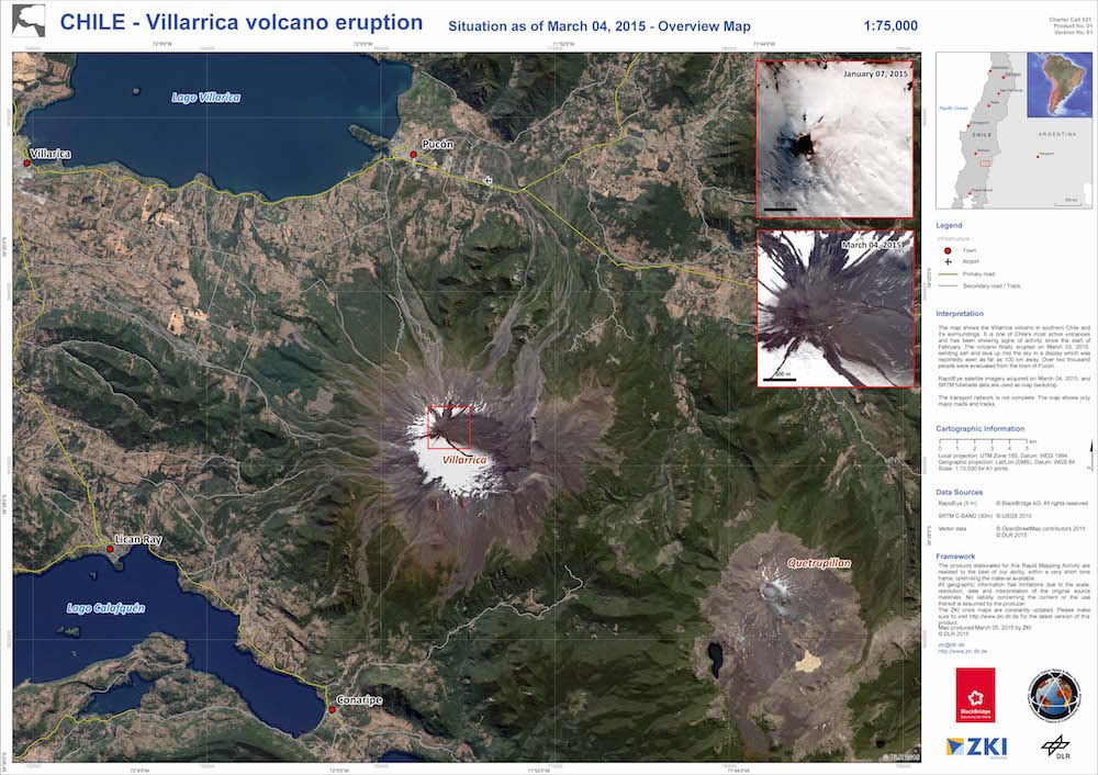 This overhead view of Villarrica was taken after the eruption taken by RapidEye, a group of five earth-observing German satellites. Of the two inset photos in the top corner of the image, the top image was taken Jan. 7, before the eruption, and the bottom image was taken March 4, just after the volcano blew ash and lava into the sky.