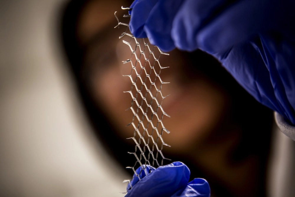 The idea for this work came from more than a decade of collaboration between paper artist Matt Shlian and materials scientist Max Shtein, both of the University of Michigan at Ann Arbor and co-authors on the new study. The devices were inspired by a work of art from Shlian in which he cut a sheet of paper so that it extended into a herringbone mesh — a kind of zigzagging pattern used in certain fabrics — when stretched.