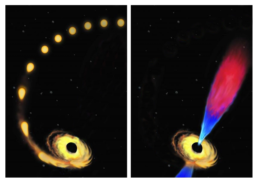 A supermassive black hole anchoring the center of a nearby galaxy has been caught in a rarely seen double act: ripping apart a nearby sun-size star and shooting out jets of debris from its center at close to light speed.