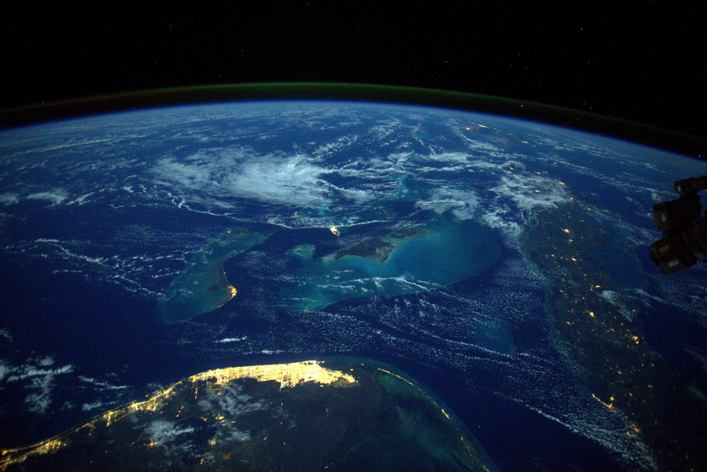 The vivid colors of the reefs around the Bahamas glow in the moonlight, with Florida visible to the south.