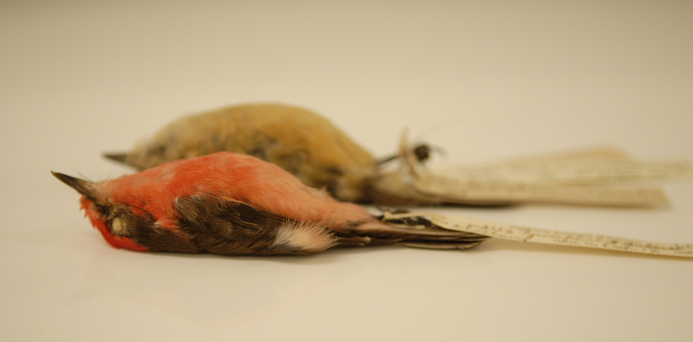 Two San Cristóbal Island vermilion flycatcher specimens lay side by side at the California Academy of Sciences. In May, researchers determined that these birds represent a species of their own, not just a subspecies as once thought. Unfortunately, this realization came too late for the San Cristóbal Island vermilion flycatcher. The birds have not been seen since alive since 1987 and are presumed extinct. [Read full story about the newly discovered Galapagos bird species]
