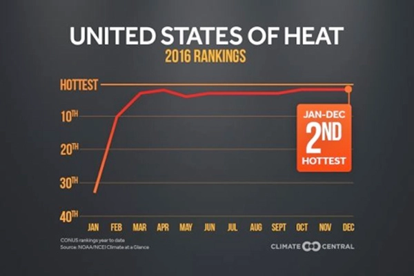 The temperature for the contiguous U.S. was 2.9°F above the 20th century average for 2016, displacing 2015 and ranking only behind 2012, when searing heat waves hit the middle of the country.