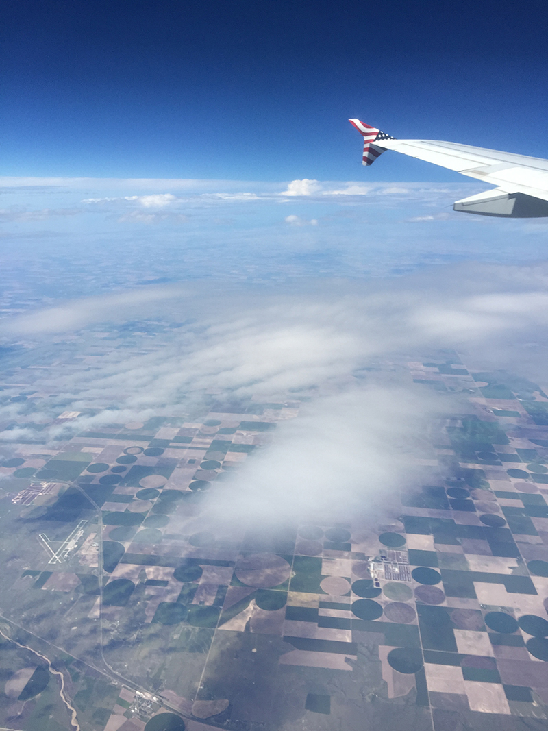 While it didn't seem to be getting darker, the glare that typically accompanies daytime flights during good weather was gone — I opened the window shade wide and didn't have to squint at all. By 1:06 p.m. local time, as we reached 37.9464 degrees north and -99.0358 degrees west — still over southern Kansas — there was solid cloud coverage beneath us, and the light was warmer than usual, as though the window were covered by a polarizing filter that had dialed down the clouds' brightness to a comfortable viewing level.