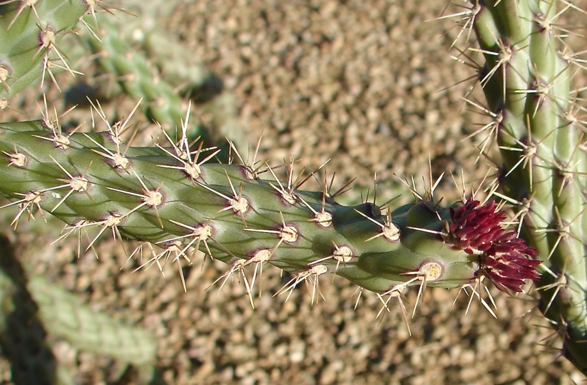 Common with all species of cactus, cholla tubular segments are covered with small, wart-like structures known as areoles. Areoles are modified branches and are the location on the cholla from which spines, glochids (small, hairlike barbed bristles), small leaves and flowers grow. Areoles and all the structures that grow from them can be seen in this photo of a beautiful blooming cholla.
