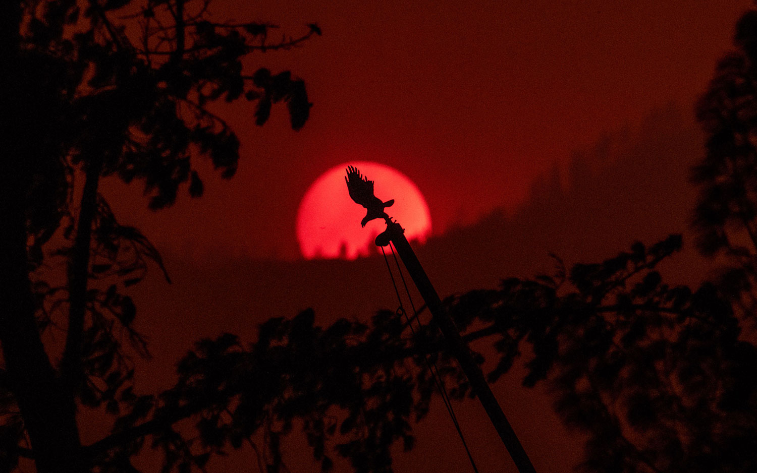 An eagle ornament at the top of a damaged flag pole is seen against the setting sun in an area scorched by the Carr Fire.