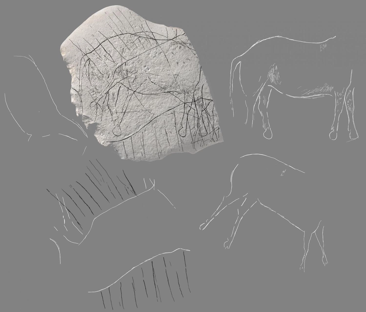 Alongside the headless horse are two, slightly smaller engravings of animals — likely a species of deer and another horse. The outline of an aurochs, an extinct species of wild cattle, is also visible. On the other side of the stone slab are fine lines delineating a horse rump.