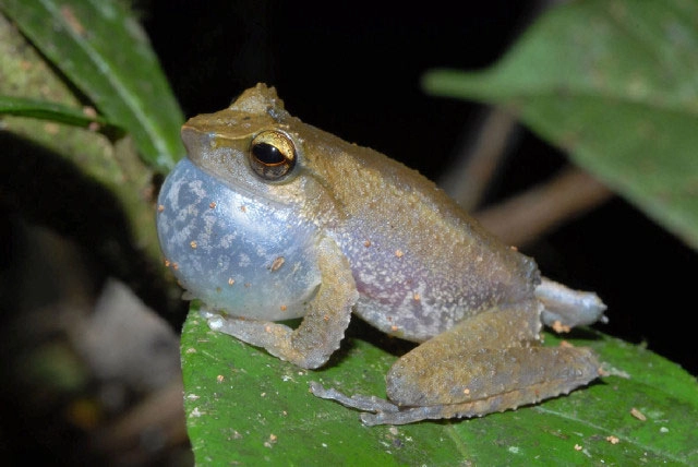 The three frogs include a tiny brown frog with a sharp chirping call (Oreophryne sp.), a bright green tree frog with enormous eyes (Nyctimystes sp.), and a torrent-dwelling frog that has a loud ringing call (Litoria sp.). The gecko (Cyrtodactylus sp.) was the only specimen of its kind found in the dense rainforest.