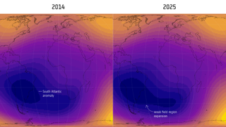 The South Atlantic Anomaly, a huge weak spot in the geomagnetic field off South America, has expanded and sprouted a lobe in the direction of Africa over the past decade.