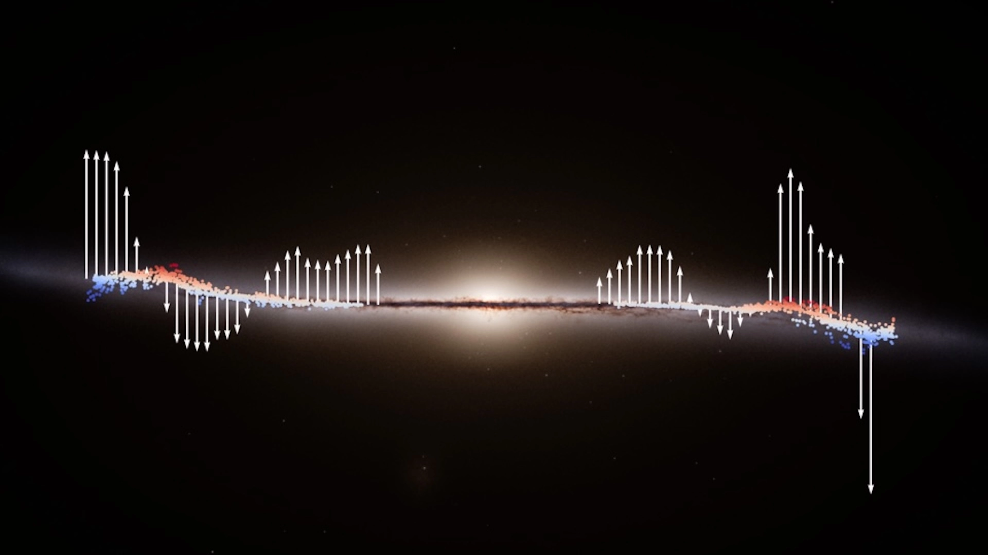 A similar type of wave motion is visible when our galaxy is observed edge-on. Such vertical motions, represented by arrows, show ripples of movement far across the Milky Way's disk.