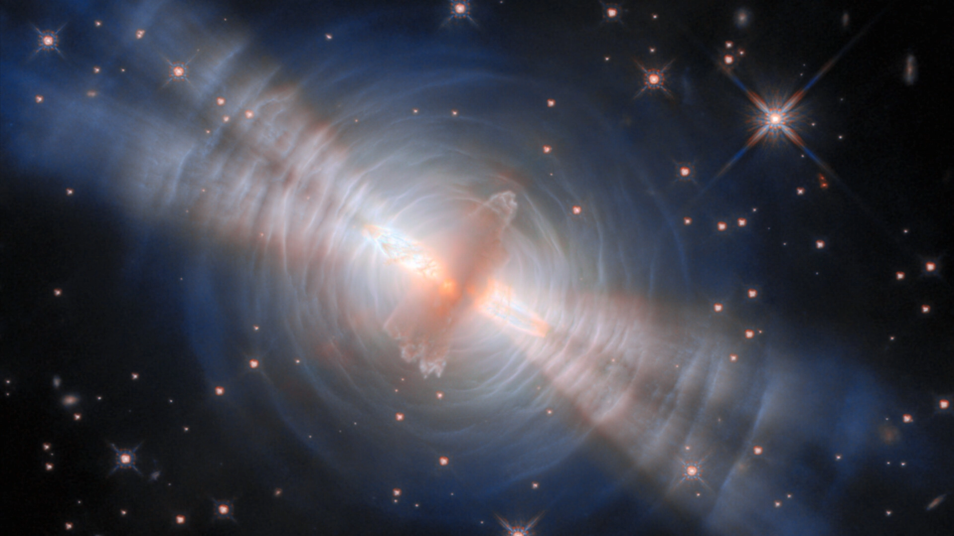 A searchlight shines through concentric circles of fresh stardust ejected by a dying star in this beautiful new image of the Egg Nebula. The dramatic scene, captured by the Hubble Space Telescope, also provides tantalizing evidence of exactly what happens to sunlike stars as they reach the end of their lives.