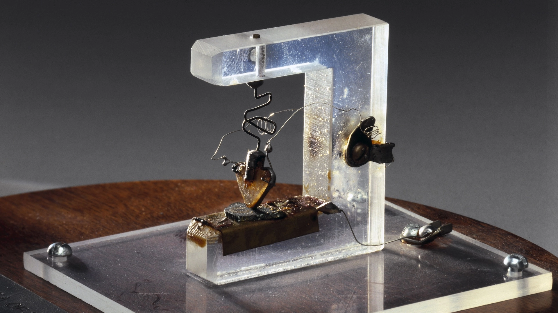 Then, in 1947, Brattain and Bardeen switched from silicon to germanium and helped clarify the physics at play in the semiconductor. Their work led to a "point-contact" transistor that used a little spring to press two thin slips of gold foil into a germanium slab. Notably, this early transistor took some finessing to work, requiring Brattain to wiggle things "just right" to get the impressive 100-fold amplification in signal.